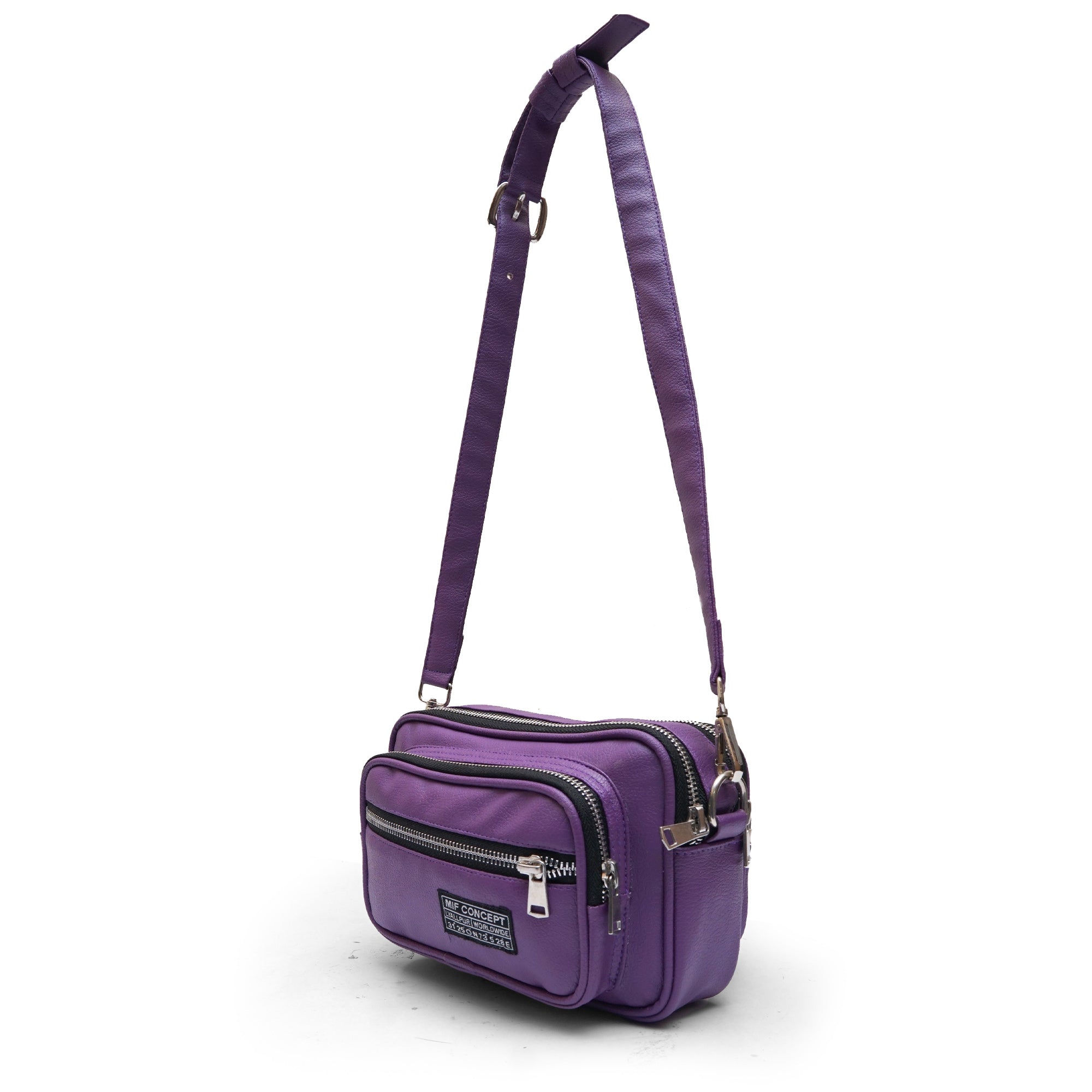 Mif Concept's sling messenger bag has been made in Lyallpur from Lilac color soft faux leather in a sleek rectangular profile. Both sides are finished with brands emblem and the chunky silver-tone hardware is another signature of the label, which gives it both an edge and sense of glamour.
