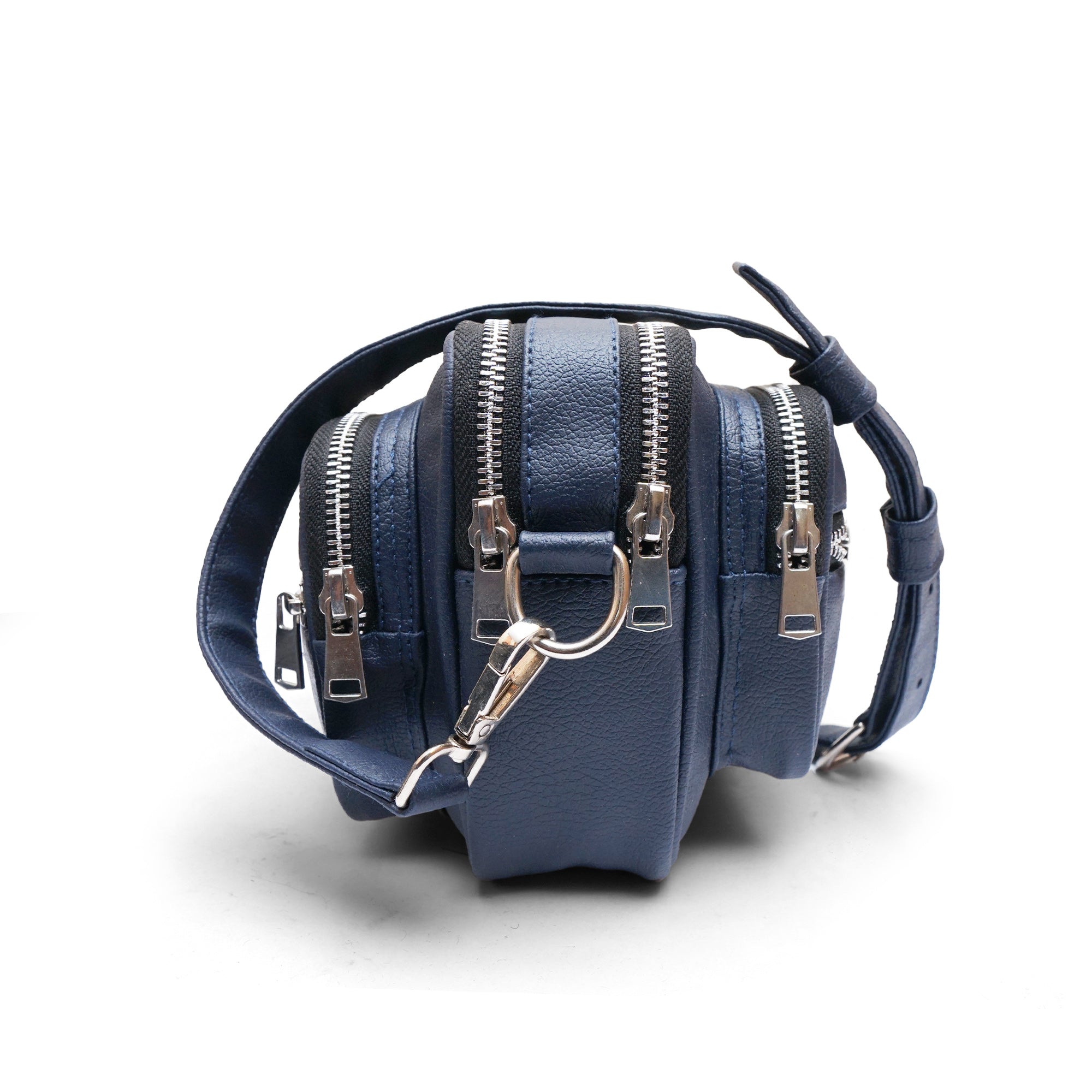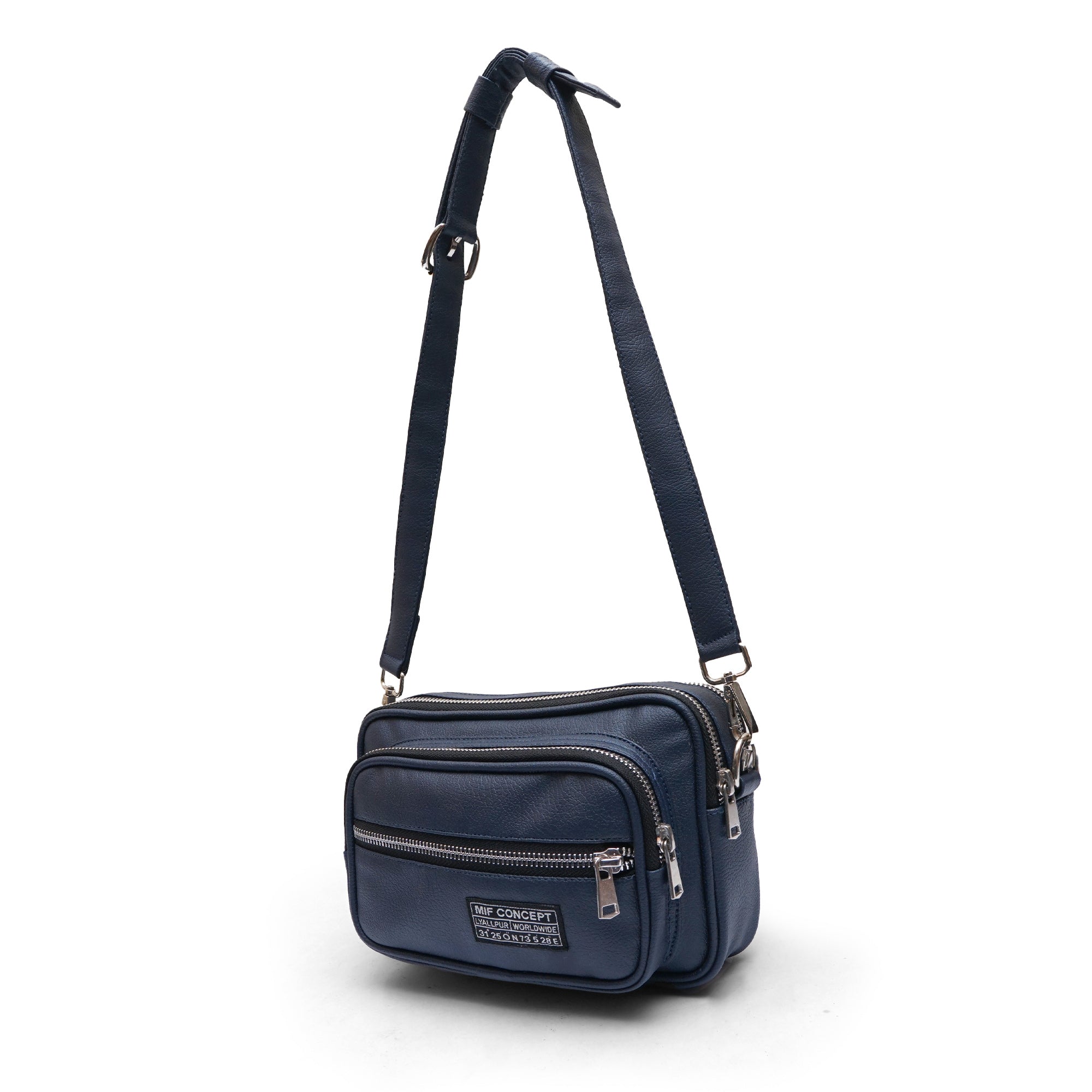 Mif Concept's sling messenger bag has been made in Lyallpur from Royal Blue color soft faux leather in a sleek rectangular profile. Both sides are finished with brands emblem and the chunky silver-tone hardware is another signature of the label, which gives it both an edge and sense of glamour.